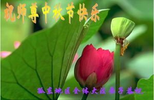 在中秋来临之际,向师父送去我们最崇高的祝福!祝慈悲伟大的师尊中秋快乐! 山西大同全体大法弟子想念师父,我们一定做好师父交给的三件事!弥补不足,勇猛精進! 山东胶州大法弟子祝师尊中秋节快乐!