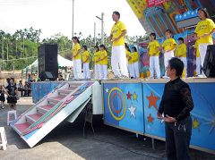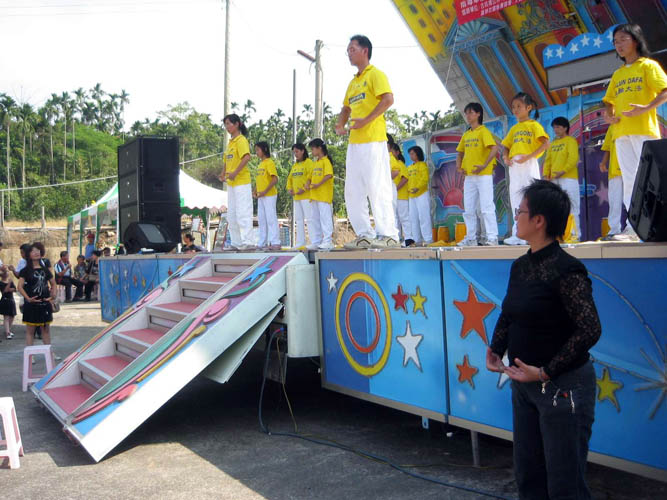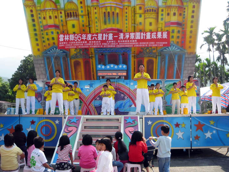 【明慧网二零零六年十一月十九日】二零零六年十一月十八日,“云林县九十五年度六星计划--清净家园计划成果展”于台湾云林县古坑乡桂林村举行,有八个以上社区参与展出,法轮功团体也应邀进行功法表演。  法轮功学员表演五套功法 |
