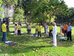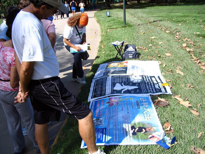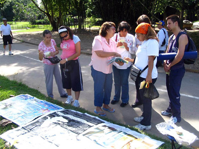 | 【明慧网二零零六年十一月二十一日】二零零六年十月十六日至十一月十三日期间,两名秘鲁法轮大法学员在委内瑞拉首都加拉加斯与委内瑞拉大法学员一起洪法讲真相,揭露中共的暴行。法轮功学员受迫害的真相,强烈震撼委内瑞拉民众的心,唤醒了民众的良知和正义。委内瑞拉人在了解真相学员们在学法炼功 委内瑞拉人爱好运动,在周末,许多人一大早驱车到公园跑步、行走和锻练。东方公园(Parque del este)正是首都各阶层人士晨运和散步的场所。法轮功炼功点就设在跑道的旁边。当揭露中共活体摘取法轮功学员器官暴行的真相图片展现在人们的面前时,驻足观看图片的人,表情凝重,惊呆了。纷纷前来询问,要求签字,支持停止对法轮功学员的迫害。 看了真相图片后的正直善良的委内瑞拉人向带来真相图片的学员致谢。感谢法轮功学员把“这个星球上前所未有的邪恶”在中国大量存在的真相告诉他们。一位跑步的女士看了图片激动的说:我们不能让共产党这个魔鬼在委内瑞拉存在,你们把真相告诉大家,做得太对了,做得太好了。你们还要讲,到处去讲,让所有的委内瑞拉人都知道中国现在所发生的事情。拜托了。 许多接过传单步行的人向学员竖起大拇指表示称赞。有一位女士看了图片,见到大法学员索取传单,说是拿给家人看。她含着泪对大法学员说:图片传单我都看过了,我害怕,害怕我们国家如果象中共国家那样,有一天,我们也会象这些被迫害的人一样。我打心里不愿意,我支持你们,非常感谢你们告诉中国发生的真相,我要让家里所有的人都知道这个真相。连续几个星期日公园摆放图片,主动签名的,主动索取传单的各阶层人士都有。 也有一两个不是太明白的人来考验学员心性的。一天,过来一位先生指着传单说我们在搞派系,学员不明白他说的是什么请他解释。他解释说,委内瑞拉现在竞选总统,现总统用的是红色的颜色,对立派用的是蓝色的颜色,你们的传单印的是蓝色的字,所以是对立派的颜色。学员平和的告诉他说:我们是从秘鲁来的,传单是在秘鲁印的,印传单的时候根本就不知道委内瑞拉竞选总统的事,更不知道对立派用的是蓝色的。我们只想告诉委内瑞拉人中国发生的事情。说着递上真相传单礼貌的说:感谢您告诉贵国选总统的事,请您关注中共迫害法轮功学员的事件。先生很乐意接过传单并与学员握手说:谢谢,很高兴能认识您。 在此期间法轮功学员走访了卡皋(chacao)市政厅市长办公室,得知中共罪行真相的市长秘书,非常乐意的表示把大法学员赠送给市长的《·九·评*共产党》西文版和西文版加拿大前亚太司司长资深国会议员大卫·乔高和国际人权律师大卫·麦塔斯写的《关于调查指控中共摘取法轮功学员器官的报告》及有关资料及时转给市长。 同时学员也走访了电台、报社、电视台等媒体。委内瑞拉“国家电台”(Radio de Naional)采访了法轮功学员,法轮功学员通过电台向委内瑞拉民众介绍了大法,让各界人士了解法轮大法的美好。临行时,电台工作人员对大法学员说:这电台的大门向你们敞开着,欢迎你们随时来访。 委内瑞拉颇有影响的《世界报》(El Universal)和《最新新闻报》(Ultimo Noticia)两家报社采访了法轮功学员。“最新新闻”报社办公大楼就设在委内瑞拉著名的旅游点潘特涌(Panteon)。学员在此旅游点发传单、炼功时邂逅了正在此地召开的纪念三周年开播集会中的“国家”电视台的工作人员。他们颇有兴趣的听了我们学员的介绍后,说:这是很严肃的中国传统文化,应该在电视台生活栏目中播放,于是把该栏目主持人的名字给了学员并约定见面的时间。 自二零零一年二月委内瑞拉法轮功炼功点成立以来,其最大的特点是以新学员为主。二零零一年四月江氏流窜到委内瑞拉后,唆使不明真相的当地警察绑架了委内瑞拉法轮功联系人,也是当时唯一的法轮功辅导员(中国人)。在仅成立2个月的炼功点上,委内瑞拉籍的法轮功新学员们目睹该国警察在中共邪恶的灌输下到炼功点抢展板和法轮功传单的暴行,在辅导员不知去向的情况下,在没有炼功的音乐带情况下,仍然自觉的在炼功点上做完法轮功完整的五套功法。这种对大法的坚定信念震慑了邪恶之徒。几年来学员换了一批又一批,而炼功点成了一个与民众息息相关不可缺少的景点。 随着正法的進程,要求学员在法上认识,在法上提高更显得重要。师父时时刻刻都在给每个学员提高的机会。新学员柏隆(Byron)在炼功点上学功仅四个月,得法前,一场车祸使他险些丧命,失去一切记忆和生活能力。在病床上整整躺了六个月后,稍微能动弹的他,不知是什么原因,让人搀扶到东方公园。自那天起与大法结下了缘。从那天起新的生命开始了。他说是大法给了他生命,不知怎么样感谢师父和大法。表示把自己经营的餐馆给大法活动使用。这样委内瑞拉大法弟子等待几年苦于没有场所的西文翻译“九天讲法录像学习班”,终于在十月三十日首次在加拉加斯正式开班了。九天学习班办的非常成功。 委内瑞拉学员在证实法中逐渐认识对学法的重要。努力去做好师父要求的发正念、学法、讲真相三件事。修好自己用最纯净的心态救度众生。