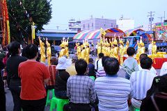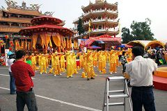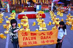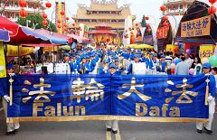 一位当地的法轮功学员表示:法轮功的各种表演队伍,包括功法展示、大型军乐队、腰鼓、舞龙舞狮、舞蹈等,在全球许多社区活动及国家节日庆典中,频繁的受邀参加;今天“腰鼓队”和“天国乐团” 第一次到这个庙会来,希望把法轮功的殊胜与美好传遍各个角落,让更多有缘的人得法修炼,同时也要把传统中华文化的精神风貌展现给民众。 这时庙埕上响起一阵清脆的鼓声,只见一群身着镶红边黄丝衫、头上裹着黄丝帽的腰鼓队员们,将鼓槌高高扬起,霎时,一串串昂扬的鼓声节奏响彻天际;一时万头攒动,远处的观众都踮起了脚跟,现场女播音员也适时的介绍“腰鼓”的起源,是中国陕北农民庆丰收的舞蹈,也让观众欣赏腰鼓时,更能体会欢庆、祥和的气息,及农民质朴奋斗的精神。 接着学员们在庙埕上表演法轮功的五套功法,许多媒体记者与现场民众不停的摄取镜头,在周围一片杂沓的人声中,群众溶入了炼功音乐平静祥和的气氛,宛如进入了一方净土。 腰鼓队的表演刚结束,博览会入口处爆出一阵掌声:远远望去,一支雄壮的军乐队正踏着整齐的步伐,在两排长长的展位中,向庙埕迈进,身着蓝衣蓝呢帽的队伍几乎把路面都排满了,当金黄色的小喇叭在阳光里发出震撼的高音时,两旁的观众不停的拍手叫好。 手执“法轮大法”绸布横幅的队员雄纠纠的把队伍带到庙埕,长而有力的哨音响起,英姿焕发的指挥将指挥棒擎向天空,指挥棒起伏间,大鼓带动了整体的声势。小号、长号、单簧管、萨克斯风、法国号、长笛的声音连番扬起,当铜钹被一位男队员抛上空中时,鼓号的气势拉到了最高点。 一位法轮功学员告诉笔者:“现在演奏的乐曲是《法鼓法号震十方》,是学员自己的创作。”一位观众自言自语的说:“我心中都没有邪念了”。 |