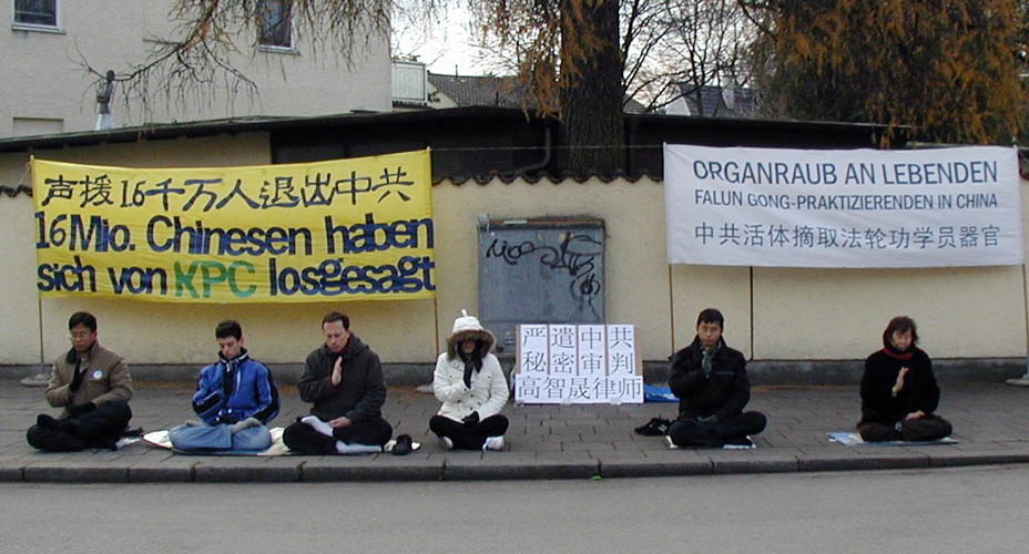 【明慧网二零零六年十二月二十一日】(明慧记者德祥报道)虽说今年欧洲的冬天迟迟不来,但二零零六年十二月十九日那天,德国慕尼黑的气温却骤然下降,变的天寒地冻起来。在中领馆对面,严寒中一字排开正在打坐的法轮功学员深深的吸引着一位老年妇女的目光。 法轮功学员德国慕尼黑中领馆前的抗议中共暴行,声援中国民众退出中共 |