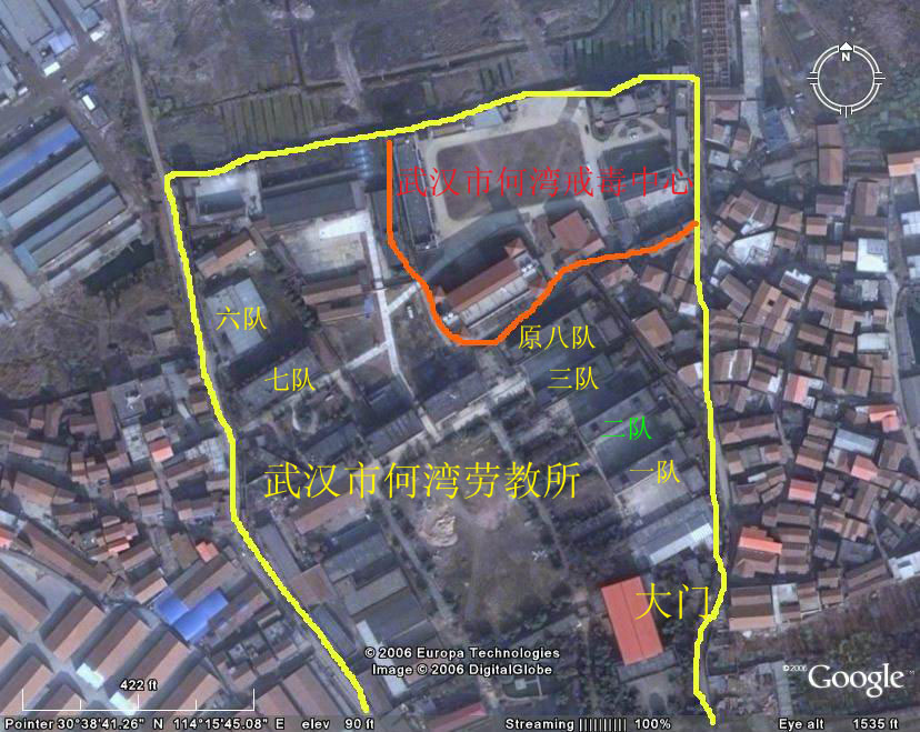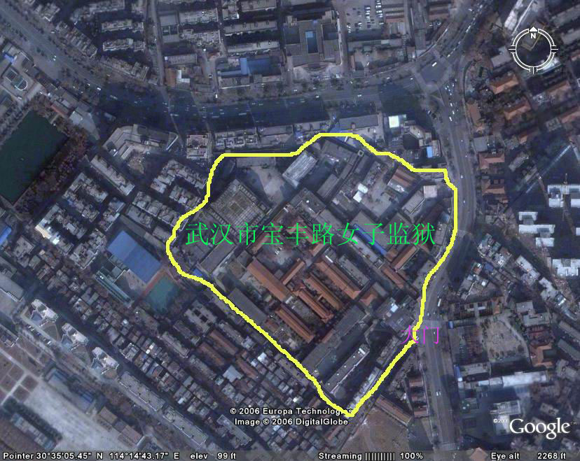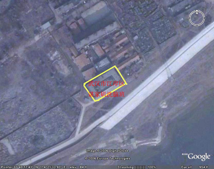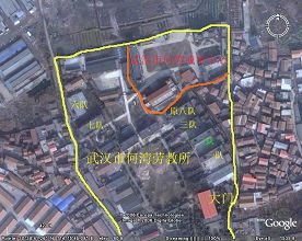 谢谢同修介绍Google Earth软件。为便于一些同修特别是老年同修想近距离发正念,却不知这些邪恶黑窝的具体地点,特将我所知的邪恶黑窝具体地点告之。 武汉市宝丰路女子监狱: 位于汉口宝丰一路可乘车1路,3路电车,中巴,548,701等到解放大道宝丰路站下车,下车后沿宝丰一路走即可看到监狱大门,也可在四干道宝丰一路或营房一村下车。可询问附近居民。 武汉市何湾劳教所: 位于汉口姑嫂树附近,可乘车到新华下路,新家家园等站下车转乘726到何湾劳教所门口下车。 武汉市江岸区谌家矶洗脑班: 位于武江谌家矶附近,乘211,212到武汉铝厂门口下车,沿对面小坡上堤,沿堤向右走,可看到一栋黄色二层小楼,呈凹字型向外,每根柱子上挂着诽谤“法轮功”的大横幅。 武汉市第一看守所: 位于东西湖二支沟,可乘中巴到二支沟下车,如果是从解放大道到二支沟的,就过马路沿对面一条小路走,然后向右转弯,走上十来米就可看到看守所大门了。 图片:邪恶的武汉市硚口区额头湾洗脑基地