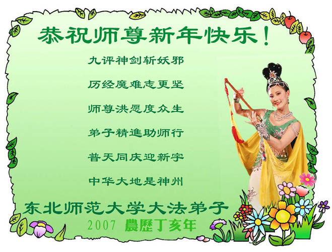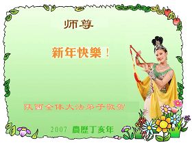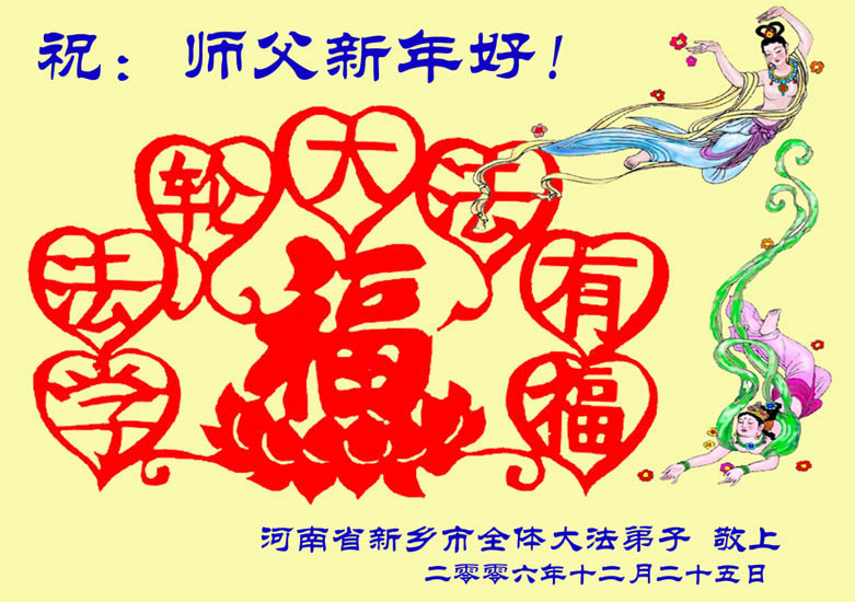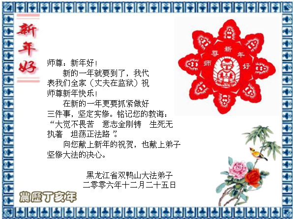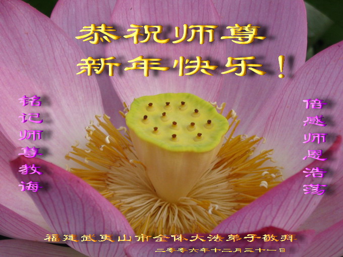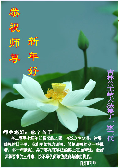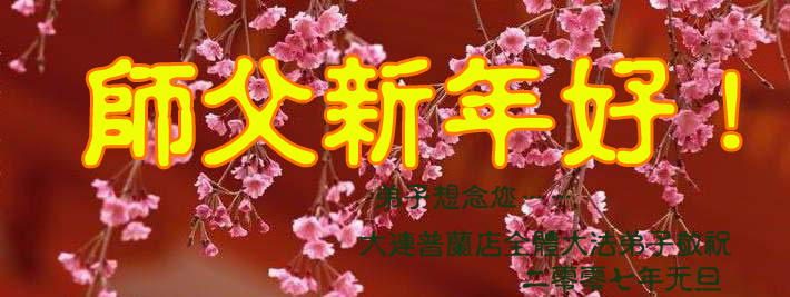 每逢佳节倍思亲。值此新年即将来临之际,我们抚顺的大法弟子万分想念慈悲伟大的师尊,我仅代表抚顺地区大法弟子在此提前恭祝慈悲、伟大的师尊新年好!祝师尊新年快乐!我们一定不会辜负师尊的慈悲苦度,肩负起正法时期大法弟子的责任,紧跟师父的正法進程,救度更多的众生。我们要在做好三件事的同时,修好自己,圆满随师还。 抚顺大法弟子 二零零六年十二月二十日 在深圳打工的大法弟子祝师尊新年快乐!
