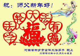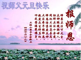 慈悲伟大的师父: 在这新旧交替之际,沈阳大法弟子向恩师问一声新年好!恭祝师父新年快乐! 邪恶的马三家子教养院和活体摘取大法弟子人体器官的苏家屯集中营都在沈阳,我们深知这里邪恶的疯狂,自己责任的重大和修炼的差距。我们一定要学好法,做到真正自己在学,做好三件事,救度更多的众生,走好最后的路,迎接法正人间的到来。 二零零六年十二月二十二日 河南周口大法弟子祝师尊元旦快乐!