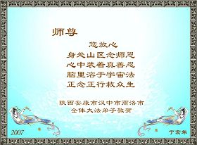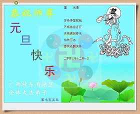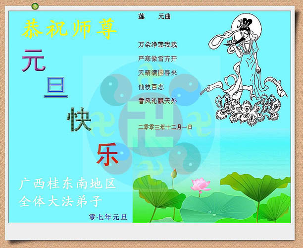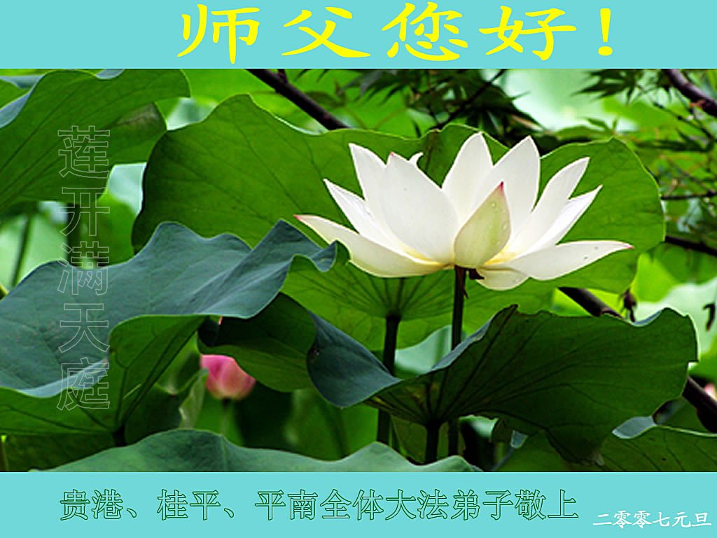 我们一定不会忘记师尊的教诲,做好三件事,坚定的走好正法之路,请师父放心! 谢师恩 严师出高徒 修行不怕苦 师言记心中 坚定大法路 修炼修在前 修心修在悟 凡尘多搅扰 功法不疏忽 正念法力大 邪恶无逃路 真相广传播 世人归正途 三件事做好 师恩不辜负 烈火魔难中 炼就真功夫 师父慈悲笑 称赞大法徒 法正人间时 共赴归家路 二零零七年元旦 弟子敬上 贵港、桂平、平南全体大法弟子元旦问候师父