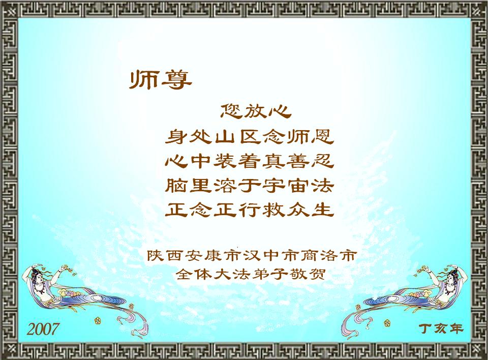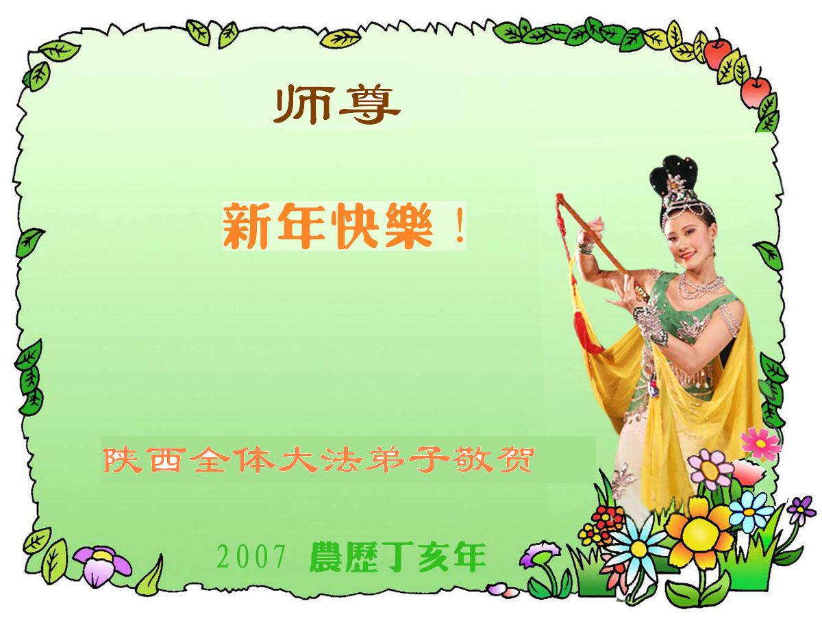 尊敬的师尊:在2007年即将来临之际,武功县全体大法弟子以最真诚的心向师尊问候:师尊新年好!师尊您辛苦了!在新的一年里,我们会加倍努力,做好“三件事”,救度更多的有缘人! 全体大法弟子叩拜师尊! 2006年12月12日 陕西省周至县全体大法弟子祝师尊新年好!