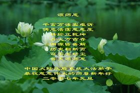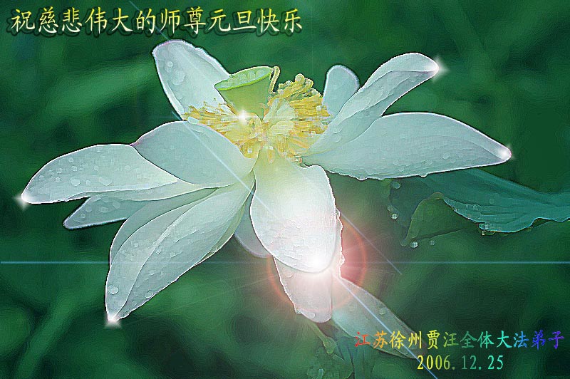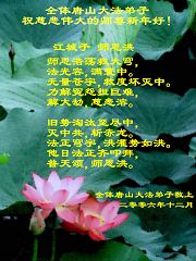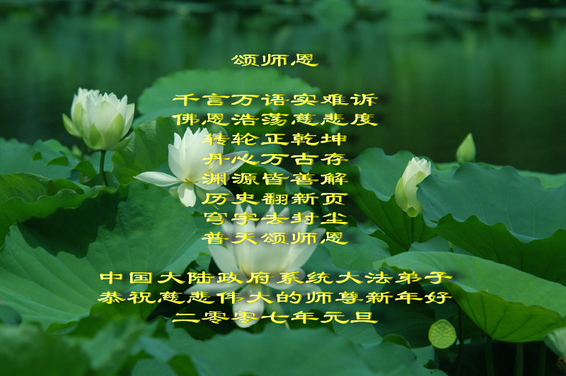 师恩颂•莲花满天宇 佛恩浩荡贯苍穹,千朵亿朵莲花栽。拨云现日祥光沐,和风喜雨盼莲开。 新芽才现叶方青,狂风骤雨突袭来。师尊慈悲擎天地,撑风破雨护莲孩。 目睹师尊劳心力,朵朵青莲泪满怀。佛恩难报唯精進,深根叶固出泥埃。 迎风破雨不复惧,唯盼恩师少操怀。乌云渐散祥云至,金光一缕迎春来。 朵朵净莲霞光罩,一身晶莹烂漫开。果正莲成佛颜笑,圆满回升遍苍穹。 全体杭州大法弟子恭祝慈悲伟大的师尊新年好!在新的一年,作为大法弟子,我们会用新宇宙生命应有的正念正行,更坚定的做好大法弟子应该做的三件事。也祝愿师尊能少一份操劳!多一份欣慰!请师尊放心,杭州大法弟子们会越走越好,越修越坚定的! 2006年12月16日 湖南教育系统大法弟子恭祝师尊元旦快乐!