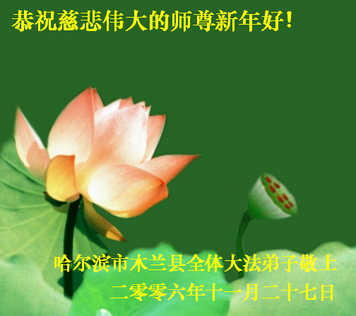 每逢佳节倍思亲。在新年来临之际,我们非常想念师尊,在此恭祝师尊新年快乐!道一声:您辛苦了。 弟子们一定不辜负师尊的慈悲苦度,认真做好三件事,在讲清真相救度众生中,发挥大法粒子的作用,救度更多有缘人,最后随师还。 黑龙江省依兰县达连河全体大法弟子敬上 二零零六年十二月二十五日 大连开发区全体大法弟子恭祝师尊元旦快乐!