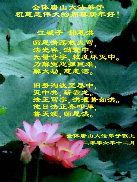 新的一年开始了,在大陆我们通过网路,看到了新!唐!人:圣诞晚会的图片,如同身临其境,振奋不已。 从中我们体会到了正法進程加快的脚步;看到了师尊给后人留下美好的神传文化;也看到了师尊亲手栽下的净莲在竞相盛开。与海外同修相比,我们的环境不同,但我们的目标是共同的。我们也会在自己过的正法路上,用我们的正念和行动去创作一幅幅慈悲祥和的画面,回报师尊的慈悲苦度。 现在我们更加认识了正法修炼的严肃和历史责任的重大,请师尊放心:我们会扎实的学好法,在做好三件事中,不断的修正自己,一定会做的更好更好,兑现我们的誓约。 天津大法弟子 2006年12月26日 河北科大全体大法弟子敬祝师尊新年好!