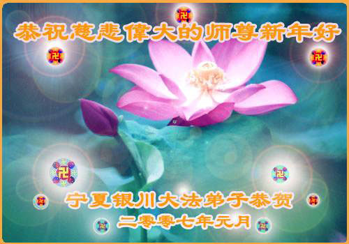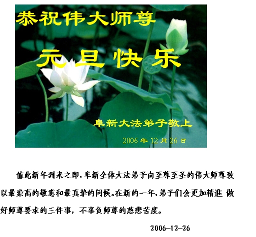 2007年元旦将至,我们恭祝师父新年愉快!弟子们想念您!弟子们沐浴在浩荡的师恩中,一定不辜负师父的期盼,广传·九·评*救度众生。 山东淄博大法弟子敬上 2006年12月26日 宁夏银川市大法弟子恭祝慈悲伟大的师尊新年快乐!