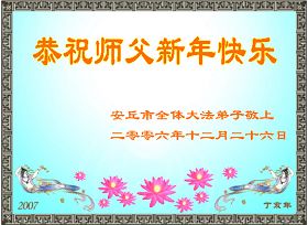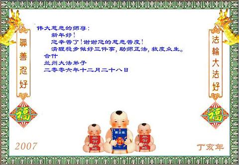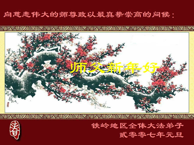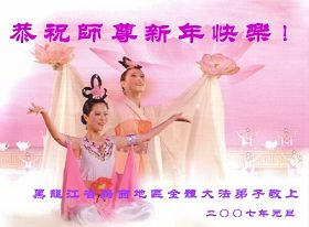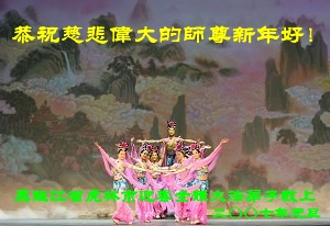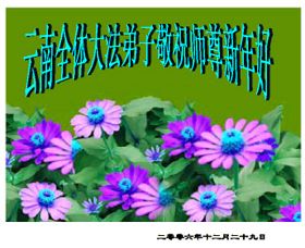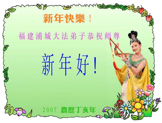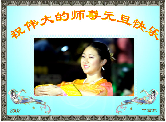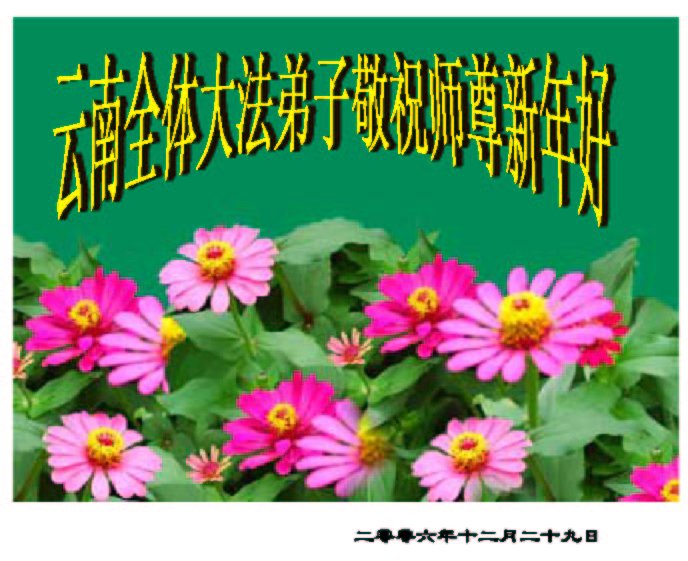 在2007年新春到来之际,祝慈悲伟大的师尊新春快乐!感谢师尊慈悲苦度,我们一定努力做好师尊要求的三件事,精進实修。 大庆市龙凤区全体大法弟子想念师尊。 云南全体大法弟子恭祝师尊新年好!