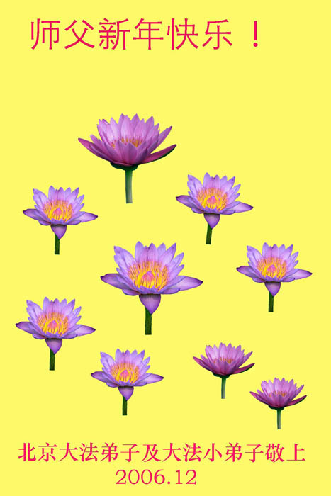 我们有千言万语,汇成一句话:师父新年好,师父辛苦了! 二零零六年十二月二十五日 外籍在京大法弟子全家祝师尊2007年新年快乐!