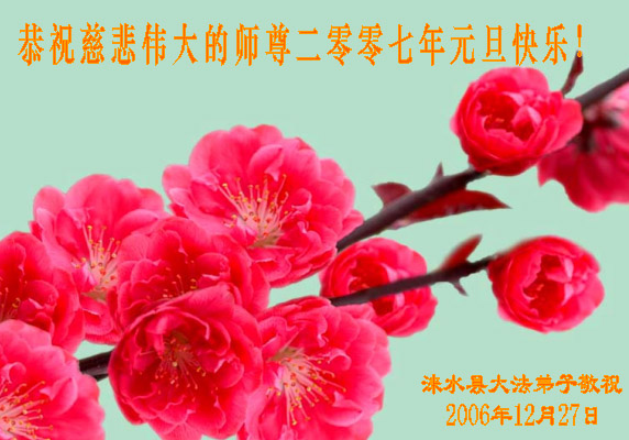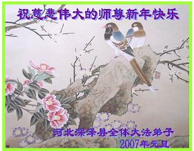 2007年元旦将至,弟子代表全家、和北京朝阳区的所有大法弟子向慈悲伟大的师尊问声师父元旦好!在此弟子向恩师保证一定做好弟子应该做的三件事,不辜负恩师的慈悲苦度!跟上恩师的正法進程。 河北省井陉县全体大法弟子恭祝师尊新年好!