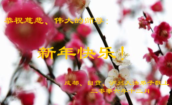 二零零七、丁亥年到来之际,佳木斯市全体大法小弟子给师父拜年,师父新年好!大陆小弟子们盼着和师父团聚的那一天,众生得救,圆满飞升,普天同庆、同祝! 黑龙江省佳木斯市全体大法小弟子敬上 二零零六年十二月二十六日 成都、自贡、泸州大法弟子恭祝慈悲伟大的师尊新年快乐!