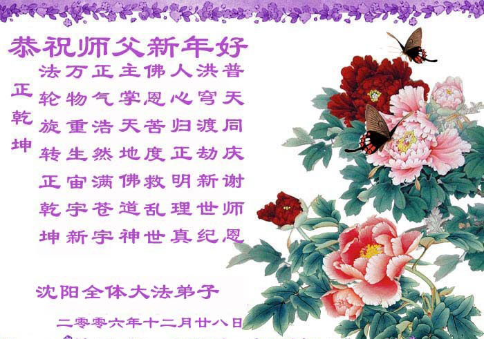 尊敬的师父:新年好! 一年一度的元旦又要到了,在此我们四川简阳市全体大法弟子恭祝师尊节日快乐! 我们回顾风风雨雨这七年的正法历程,感慨万千,我们最想对您说:“师父您辛苦了,您的无量慈悲是所有宇宙众生都无法用语言来表达的,我们四川简阳市所有的大法弟子一定做好助师正法的三件事,兑现我们的史前大愿,不辜负师尊的殷切期盼。” 四川简阳市全体大法弟子敬上 2006年12月27日 辽宁省抚顺市新宾县全体大法弟子恭祝师尊新年快乐!