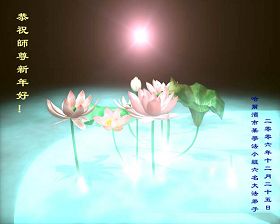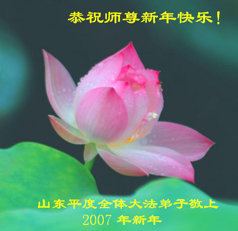 弟子谨记师尊的教诲勇猛精進、做好三件事、完成史前大愿,不辜负师尊的慈悲苦度和众生的期盼!弟子们向师尊叩拜 心愿 师恩浩大穹, 待徒雄狮勇。 徒儿若懈怠, 愧师与众生。 新年无数载, 愿师多珍重! 儿知精進猛, 整体随师行。 未来展现前, 珍惜每秒钟。 二零零六年十二月二十六日 山东日照全体大法弟子恭祝师尊二零零七年新年好!