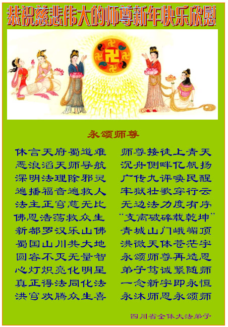永颂师尊 休言天府蜀道难 师尊接徒上青天 恶浪滔天师导航 沉舟侧畔亿帆扬 深明法理除邪灵 广传·九·评*唤民醒 遍播福音遍救人 牢狱壮歌穿行云 法主正穹慈无比 无边法力度有序 佛恩浩荡救众生 “支离破碎载乾坤” 新都罗汉乐山佛 青城山门峨嵋顶 蜀国山川共大地 洪微天体苍茫宇 圆容不灭无量智 永颂师尊再造恩 心灯炽亮化明星 弟子笃诚紧随师 真正得法同化法 一念新宇即永恒 洪穹欢腾众生喜 永沐师恩永颂师 四川省全体大法弟子 河北省望都县全体大法弟子祝师父新年快乐