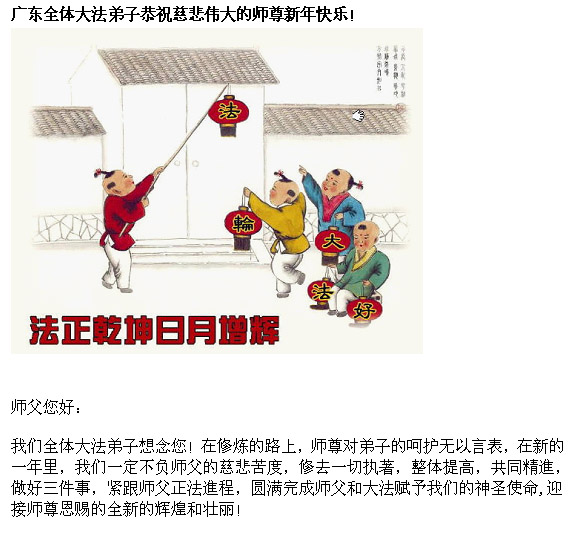 在新的一年里我们紧跟师父正法進程,做好三件事,救度更多的众生。走好、走正、走稳最后的路,兑现我们的誓约,不负师恩。 广州全体大法弟子 二零零六年十二月二十八日 广东全体大法弟子敬祝师尊新年好!
