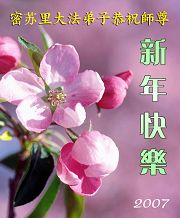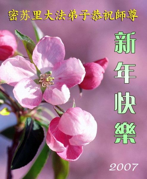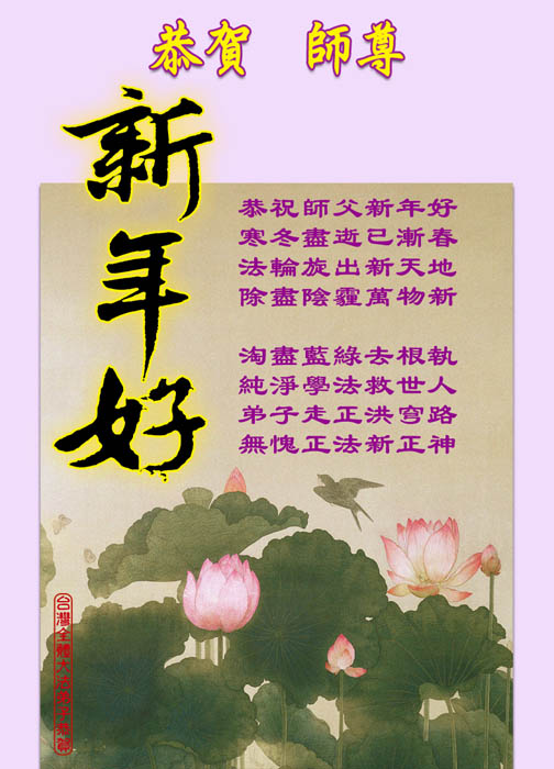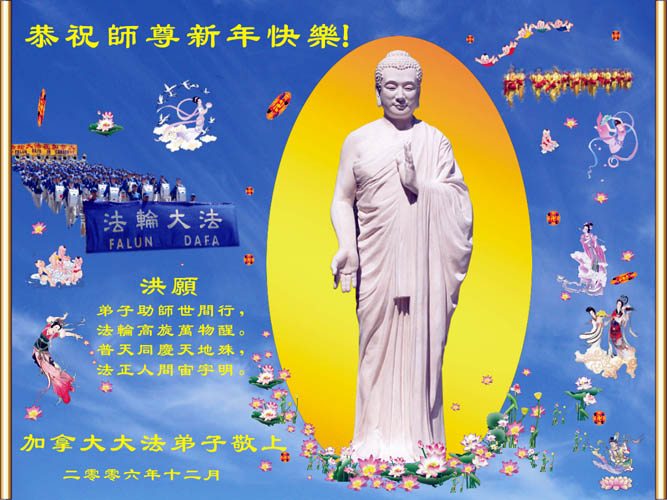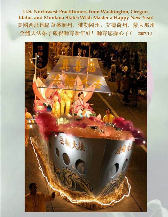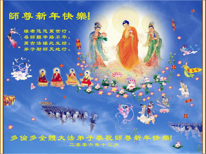 一叶方岛沐师恩, 千万众生喜得度。 正念除恶神州近, 真相遍传中原路。 法正大穹天威至, 同贺新宇无量福。 台湾全体大法弟子敬贺 西元二零零六年十二月三十一日 美国西部华盛顿州、俄勒冈州、爱达荷州、蒙大拿州大法弟子恭祝师尊新年快乐!