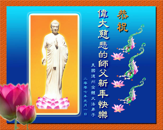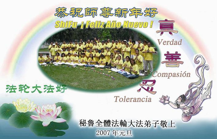伟大的师尊: 值此新年来临之际,美国德州全体大法弟子向慈悲伟大的师尊致以最最崇高的敬意与感恩并表达弟子们最诚挚的问候:师父新年好,师父您辛苦了!谢谢您的慈悲救度。 请师父放心,弟子们一定勇猛精進,做好大法弟子该做的三件事!无愧于正法时期大法弟子这伟大的称号和殊荣。决不辜负师父的慈悲苦度!请师尊放心! 美国德州全体大法弟子叩首敬上 二零零六年十二月二十八日 秘鲁全体法轮大法弟子恭祝师尊新年快乐!