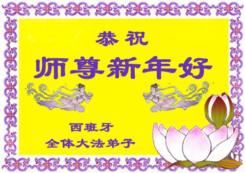 正法洪势 开新天地 宇宙净化 众生重生 圣王下世 扭转乾坤 伟大壮举 可歌可泣 师尊转轮 震撼全宇 慈悲苦度 感天动地 弟子心言 难报师恩 唯更精進 永不离弃 西班牙全体大法弟子恭祝慈悲伟大的师尊新年快乐!