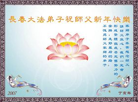 师尊:您好! 在2007年新年来临之际,我们北京市宣武区大法弟子恭祝慈悲伟大的师尊及师尊的全家新年快乐!“每逢佳节倍思亲”弟子们无时无刻不在思念着远在大洋彼岸的师尊,盼望着和师尊相见重逢和海外大法弟子欢聚团圆的那一天的到来。 弟子们深知,唯有听师尊的话,学好法,做好三件事,才能不辜负师尊的重托。不管前面的路还有多长,不管邪恶多么猖狂,我们一定做到:“坚修大法心不动”,请师尊放心! 再一次恭祝师尊新年快乐! 北京市宣武区大法弟子 2006年12月29日 天津市大港区大法弟子祝师尊元旦快乐!