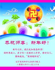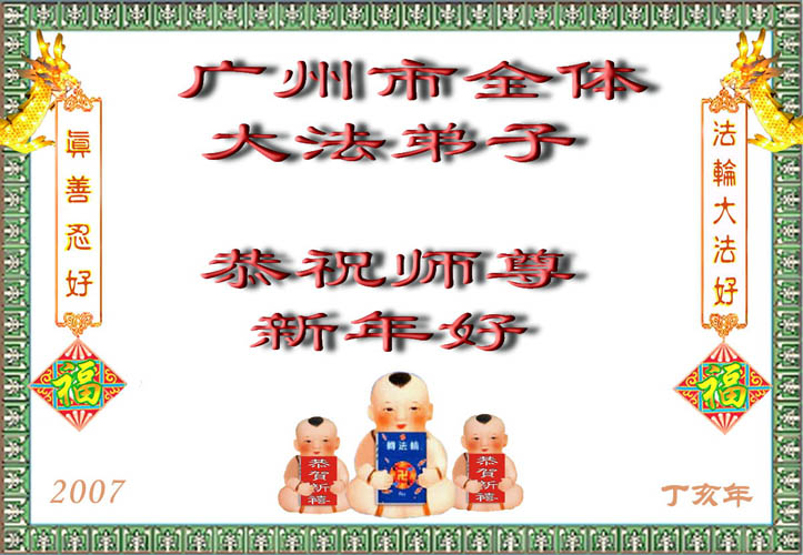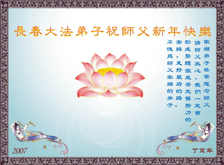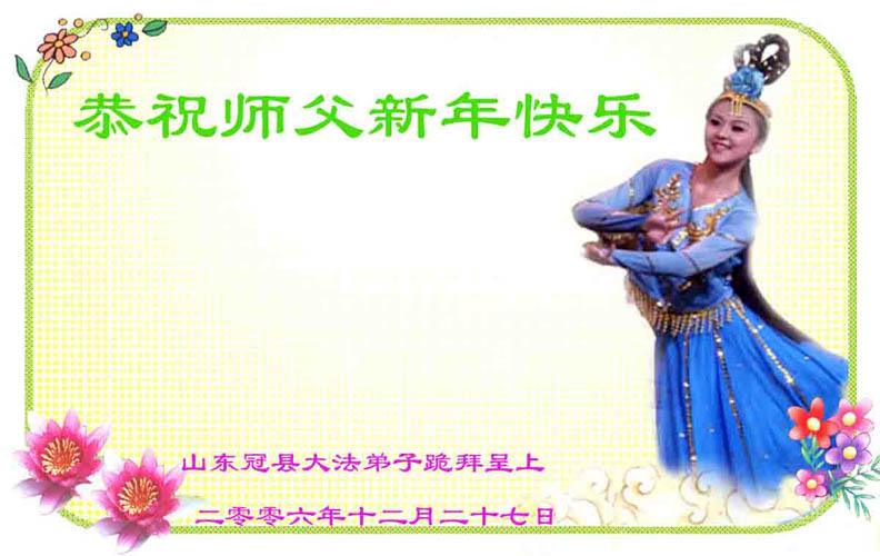 恭祝师尊:新年好! 新年之际,我们更加想念师尊!请师尊放心,弟子们一定做好三件事,修好自己,整体提高,“圆满随师还”。 沈阳市大法弟子敬上 二零零六年十二月三十日 安丘市全体大法弟子祝师父新年好!