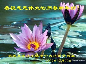 谨代表大连市中山区全体大法弟子恭祝慈悲伟大的师尊新年快乐! 在新的一年里,弟子一定会做好三件事,走好最后的路,请师父放心。 大连市中山区全体大法弟子敬上 二零零六年十二月三十日 辽宁省辽阳市大法弟子祝师尊新年快乐
