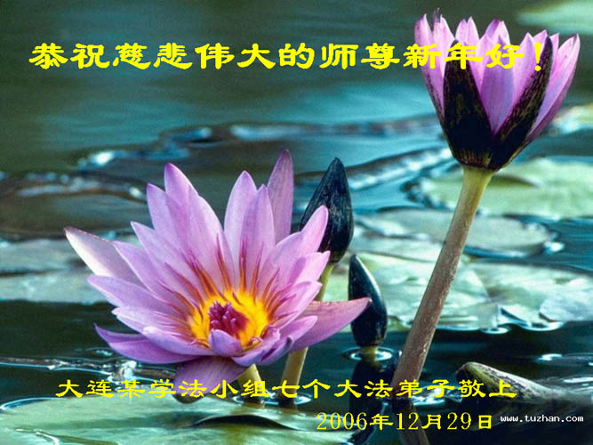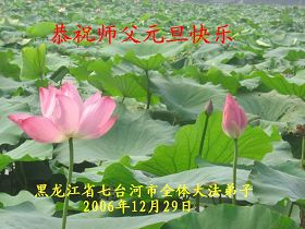 师尊,值此元旦佳节来临之际,请接受弟子们的节日问候,师尊您辛苦了!祝慈悲伟大的师尊节日快乐!请师尊放心,我们将抓住正法進程的最后时光,利用好这转瞬即逝的机缘,在我们的环境中做好三件事,不辜负师尊的慈悲苦度,完成我们史前的洪愿。 北京房地产界大法弟子合十敬上 二零零六年十二月二十九日 郑州市大法弟子祝师尊元旦节快乐!