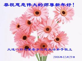 在新的一年里,我们全体大法弟子一定会更好的协调,圆容加倍的做好三件事。不辜负师尊的慈悲苦度。争取早日随师回家。2006年12月30日 北京大法弟子恭祝师尊新年好