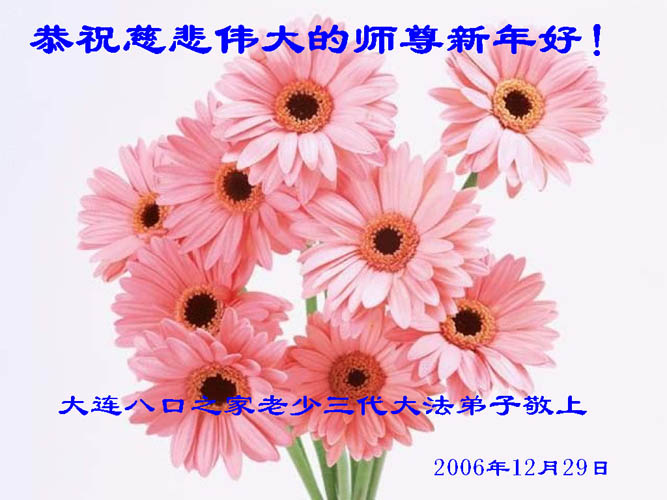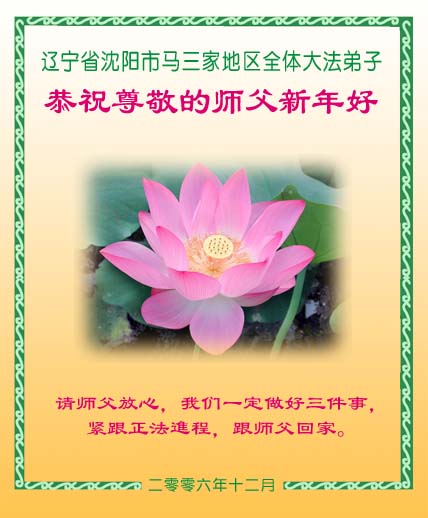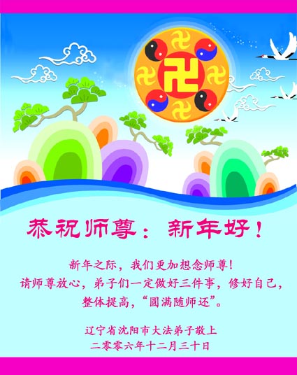 新年将至,中共恶党迫害大法仍在继续。我们大法弟子怎么办?那就是认真学法,兑现史前大愿。运用师父给予大法弟子的智慧把三件事做的更好,稳健走好每一步,让师父放心。 祝师父新年快乐! 石家庄大法弟子 二零零六年十二月二十八日 辽宁省盖州市大法弟子向师尊问好!