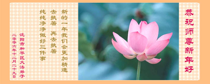 新的一年我们会更加精進,再去执著,纯纯净净做好三件事。 沈阳市和平区大法弟子 二零零六年十二月二十九日 本溪全体大法弟子恭祝师尊新年快乐!