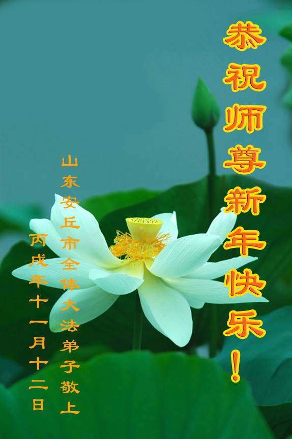 祝我们的师父新年快乐。 请师父放心,我们正在向海阳人民讲清着真相,我们也正在努力的做好三件事。 请师父放心,我们尽管走过弯路,在师父的呵护下我们也正在归正。 请师父放心,我们有信心也有决心做好三件事。我们知道证实法,救度众生,解体邪恶,修好自己这就是师父要的,这就是师父的期盼。 师父啊,我们以前做的不好,真觉得没脸见您,但我们真是从内心里想念您啊。 南京城南地区的大法弟子祝慈悲伟大的师父新年好!