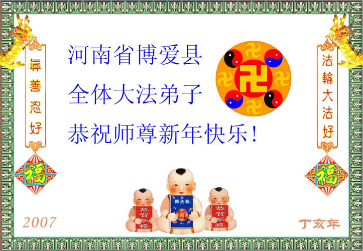 想念的师尊: 在这2007年的新年到来之际,我们倍加想念恩师,多么盼望师尊能早日回到家乡,回到中国大陆团聚!让我们远隔重洋问候一声:伟大的师尊您好! 自从7.20江氏流氓集团迫害以来,在恶党黑浪翻滚,天翻地覆人妖邪的艰难岁月里,在师尊的指引与呵护下,大法弟子突破了一道道难关,顶住了重重的压力。众弟子从遇迷走向理智,从常人变成超常人最后将成为觉者。这一切都凝聚着师尊的心血,展现了师尊洪大的慈悲!为了不负师尊苦度之恩,我们全镇大法弟子一定抓紧这悠悠万古洪势即将到来之前的短暂之时刻,竭尽做好师尊要求的三件事,救度更多的世人,在神的路上勇猛精進!祝师尊新年快乐!合十! 横头山全体大法弟子 2007.12.30 河北成安大法弟子祝师父新年好!