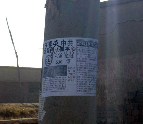 近日笔者获悉,浙江中共邪灵极尽信息封堵、思想桎梏之能事,意图让其控制下的中国民众,只能去做邪*党-恶政之下的奴才。 其中两件事情尤其令人发指。一是东阳市教委,居然在全市中、小学教师中间推行所谓“绿色上网工程”,所有教师上网电脑均被统一编号,用户名、密码及唯一IP地址俱被全盘监管与监控,但凡被视为“不安全”、可能与邪*党-文化相左的网站,一概被封锁。据相关教师披露,他们再也不敢随意浏览网页,更不敢在QQ聊天或社区论坛里随便发言,因为一举一动、一言一语均在教委及警察的掌控之内,谁都唯恐一言不慎而招致麻烦甚至迫害。 二是浙江公安职业技术学院,为使所有教师在课堂不说一句稍有针对邪灵恶党不利的言语,便对教学进行全程录象监控。许多教师因此而辞职,留下来的则只能按部就班,照本宣科,一切都以密切配合邪*党-的政治意图为唯一选择。 由此足见,邪*党-及其帮凶,业已恐慌到什么程度,又愚蠢、专制到什么程度。但望所有深受其钳制与伤害的人们,立即行动起来,全面破除这类严重违背思想自由、精神独立原则的罪恶行径。 西北某市的退!党!标语和传单