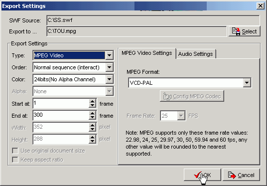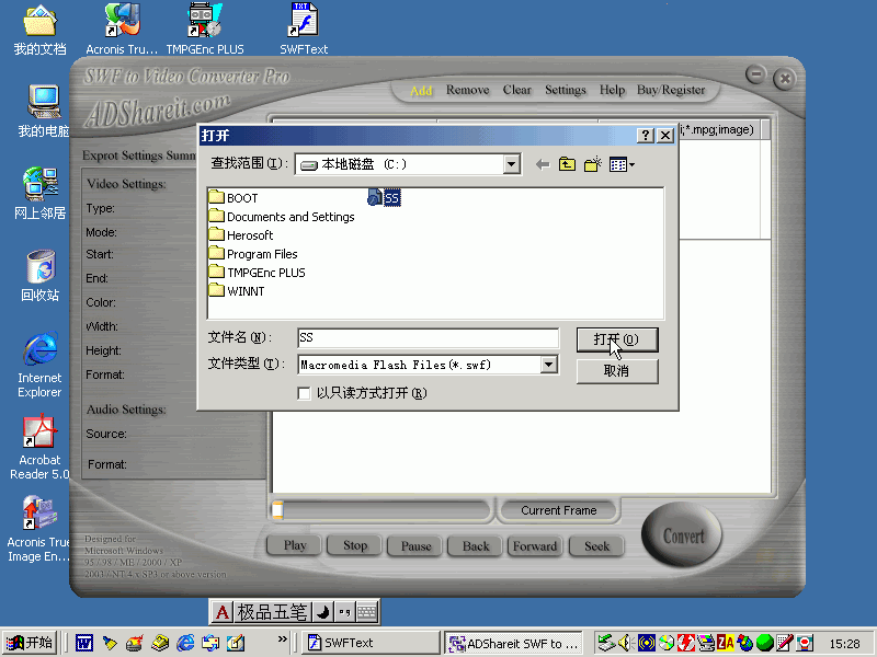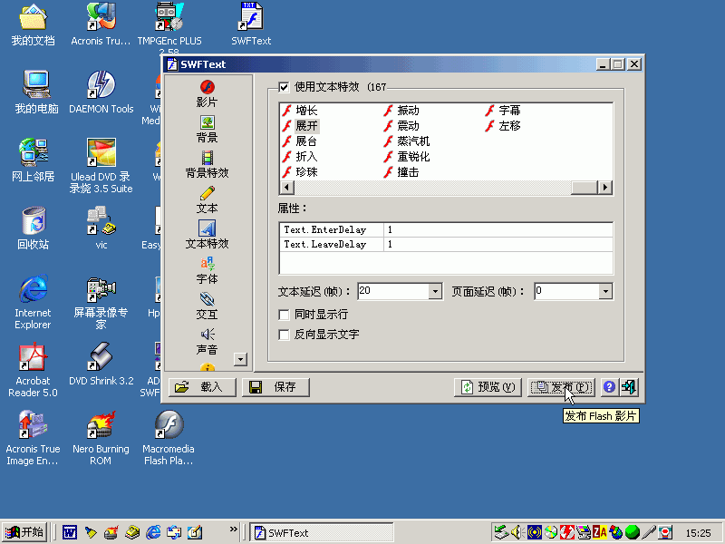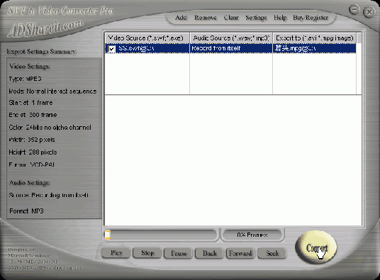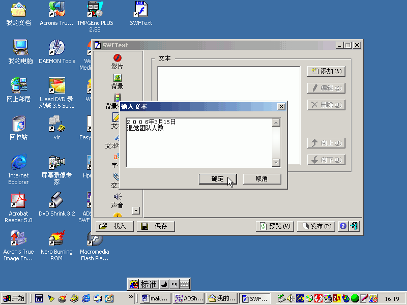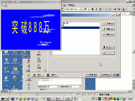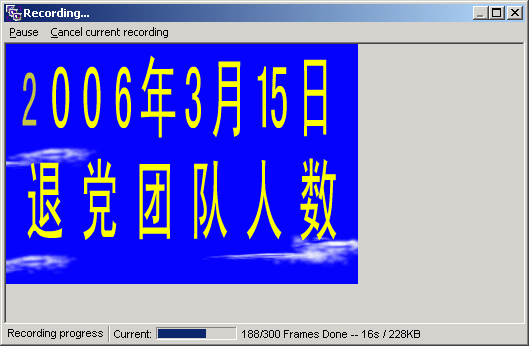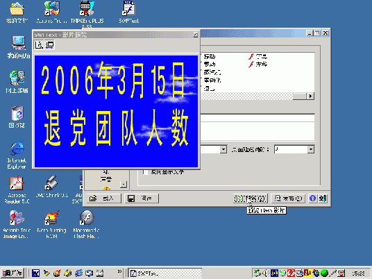 | 【明慧网2006年3月20日】·九·评*电影对于讲真相是非常好的视频材料,但是退!党!人数不能更新,虽然放光明网站,有更新数字的现成片头,但是很长时间才能更新一次。如果我们自己动手花费一两个小时,就能做出不错的退!党!人数片头,是一个好的办法。 制作过程中需要三个主要的软件。 第一个是SWFText它是一个简单的把文字做成闪画的软件,非常简单适用。下载的地点是清新论坛,安全相关,常用软件从组版。文件名是SWF Text1.2绿色版。 第二个软件是SWF TO VIDEO CONVERTER PRO 该软件是把做好的闪画文件转换成mpeg视频文件。到网上搜索一下就可以找到,本人是在买的一张光盘中找到的。 第三个软件就是最常用的TMPGENC PLUS 2.58 ,可以进行视频合成、分解、剪辑等。 安装SWFText绿色软件,把下载的压缩包解压即可,同时需要安装闪画播放软件FLASHPLAYER6.0以上版本来支持。双击该软件,出现下面的画面,点影片,宽度设为352、高度设为240。 点背景,一共有四个选项,第一项是选单一颜色,我们这里选蓝色,当然也可以选渐变,或背景图片。背景透明我一般不用。 点背景特效,有上百种,我们这里选-飘云。 依次点文本、添加,输入文字,可以分多行写,点确定,第二次点添加,输入文字。每次添加的一版文字显示在单独的画面上。添加两次即分两屏显示。 点字体,具体设置如下,黑体字、黄色、文本大小65、字宽度60、字间距40、字高度140、行间距100。 点文本特效,有很多选项,我们选择-展开。 点声音,把FLASH影片中播放背景音乐或声音前边打勾。点浏览,选定一个音频文件只能是MP3或WAV格式。 点浏览,这时我们就可以看到声像俱全的实际闪画效果了。 第二部份画面。 点发布,就可以把做好的闪画存放到一个目标文件夹里了。 使用软件“SWF TO VIDEO CONVERTER PRO”把做好的闪画转换成mpg视频文件。双击该软件,打开它。 点[Add]添加按钮,找到刚才制作好的闪画文件SS.swf,点打开。 在出现的软件界面上,设置好参数,Type —MPEG Video , End at — 300, MPEG Format— VCD-PAL,点Select选择转换完的视频(MPG格式)文件存放的位置,点OK。 点[Convert ]准备进行转换。 点Start 正式进行转换。 正在转换中…… 最后一步,用TMPGenc软件把上面转换完成的视频文件进行剪切,位置在22-23秒处,也就是本片段一共出现两次日期和三:退.人数之后,把多余的部份切掉。然后把做好的退!党!人数视频片段加入 到·九·评*电影的适当位置就大功告成了。本文设置的参数都是自己的一点经验,仅供参考。具体设置可以自行调整。