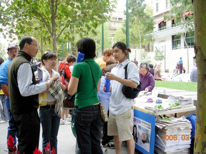 【明慧网2006年3月20日】第十八届英联邦运动会于2006年3月15日至26日在墨尔本召开。英联邦运动会是仅次于奥运会的全球第二大综合性体育盛会。来自五大洲七十二个国家,约三百万民众莅临墨尔本观看比赛。墨尔本法轮功学员借此机会,举办各种活动,洪传大法,向世人揭露中共迫害法轮功的惊天暴行,活动同时得到了来自全澳其它各省以及台湾学员的鼎力支持。  学员们在公园讲真象 |  游客了解真象 |
