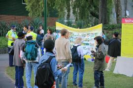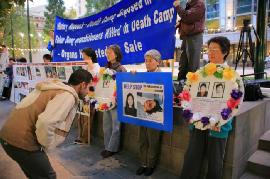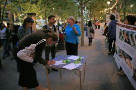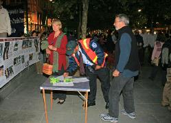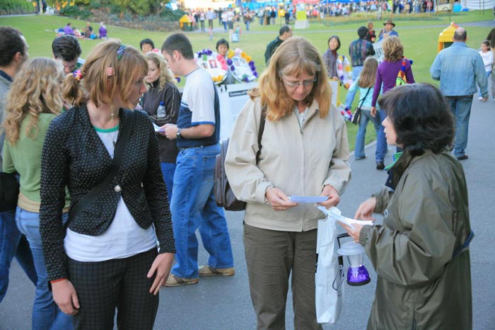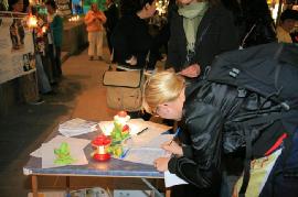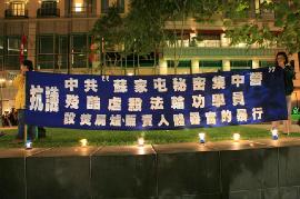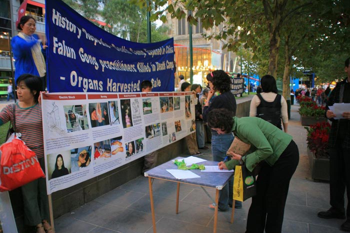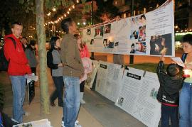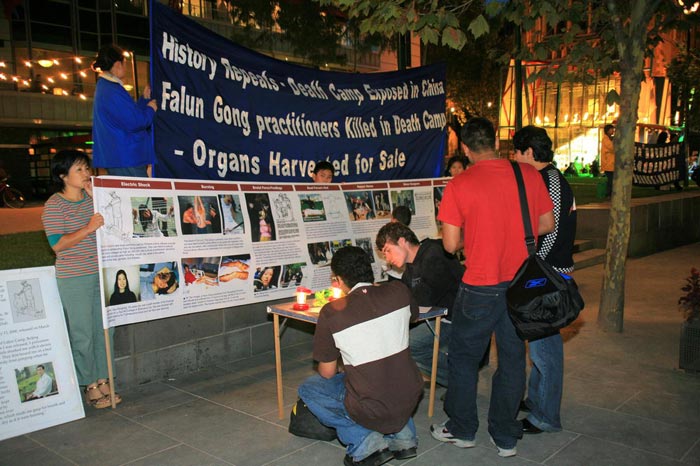 3月17日上午十点,过往的人流在市中心熙熙攘攘,城市广场征签点上,学员们摆开展牌,向民众分发资料,并在草地上進行功法演示。许多游客在展牌前驻足,仔细阅读法轮功被迫害真相。有的游客表示,早已听说法轮功,知道千千万万法轮功学员在中国遭到残酷打压,但得知苏家屯集中营事件,依然感到无比震惊。也有来自土耳其、印度等国家的游客还没有听说过法轮功,当他们看到祥和优美的功法演示,听到中共骇人听闻的暴行,无不对迫害感到义愤填膺。 一位中国留学生听到苏家屯事件后,表示不能相信,学员从中共建政以来对中国人民犯下的种种罪行,屠杀八千万中华同胞讲起,讲到中共在全世界人民面前焚烧中国人,制造天安门自焚伪案,论及中共反人类的嗜血本性,并送给他一本《·九·评*共产党》小册子,他神情肃穆,不停的点头,郑重接下《·九·评*》。 游客签名声援法轮功人们心中的正义感被强烈的触动了,他们纷纷在谴责迫害的征签表上签下自己的名字,由于签名的人络绎不绝,人们自觉地排起队来,等待签名。年轻人的反应最为强烈。有一群刚刚表演后路过的年轻人,饶有兴致的跟着学员一起炼功,然后大家一起签名声援法轮功;有的年轻人自己签了名之后,又迫不及待的问: “我们能不能替父母把名也签上?他们一定愿意签的。”还有一位少女,在得知学员将在运动会期间常设展位后,问学员要了一张征签表说要让更多的人知道这件 事,签名声援法轮功,然后含泪离去。人们把接到的真相资料珍惜的收放起来,整条大街上,没有人遗弃一张真相资料。 征签活动一直持续到晚上十点,学员们掌着灯,不断有民众排着队签名声援,情景感人。期间,不少人询问在哪里能学炼法轮功,对功法之神奇十分向往。更有两位稚嫩小童,索性马上要求学员教炼打坐,父母对他们说早点回家,以后再说,小童很认真的说:“我必须把这件事做完才能走。”  游客观看展板和横幅。 |  夜晚,法轮功学员仍坚持讲真相 |