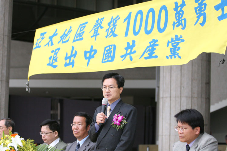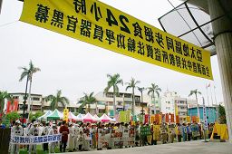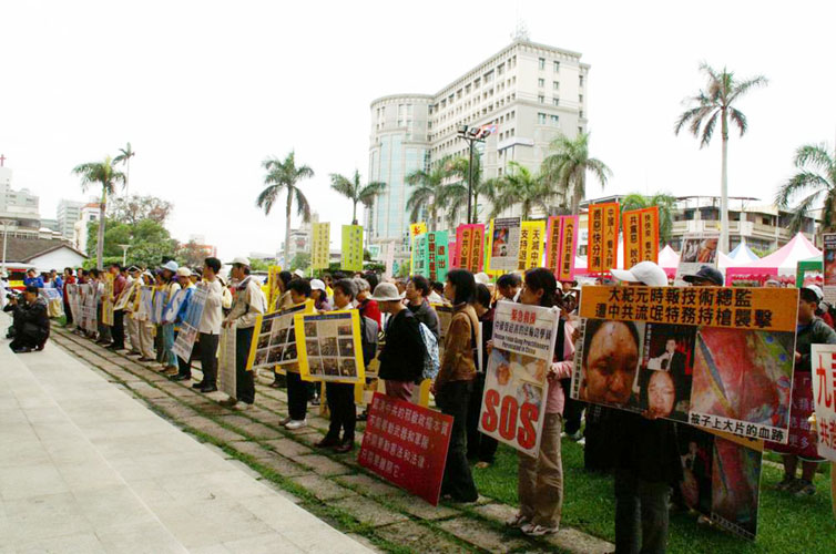 | 【明慧网2006年4月17日】2006年4月15日至16日,台湾与亚太九个国家地区同步24小时绝食抗议中共劳教所暴行,16日上午十时绝食活动结束后,台湾法轮功学员随即在彰化县政府广场举行记者会,并游行彰化市区,许多路人及商家纷纷投以关注。 台湾法轮大法学会呼吁中共领导人胡锦涛开放中共所有劳教所、监狱等关押法轮功学员的地方接受国际调查,同时呼吁布什总统关注中共劳教所盗卖器官的暴行。   在彰化县政府广场举行记者会 |   立委魏明谷声援法轮功反迫害 |