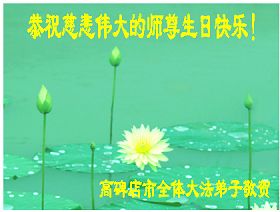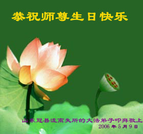 日复一日,年复一年,我们已在邪恶的迫害中走过了七年,七年里我们的心里无时不想念着师父,无时不盼望着与师父相见。今天,师父农历生日将至,我们怀着无比崇敬的心情祝贺师父生日快乐!同时,我们也向师父保证,做好三件事,救度更多众生,用实际行动作为向师父献寿礼的礼物。 湖北省嘉鱼县全体大法弟子合十敬上! 2006年5月4日 山东省安丘市大法弟子恭祝师尊生日快乐