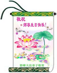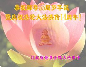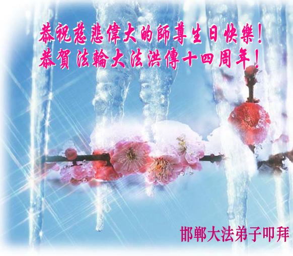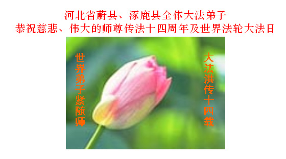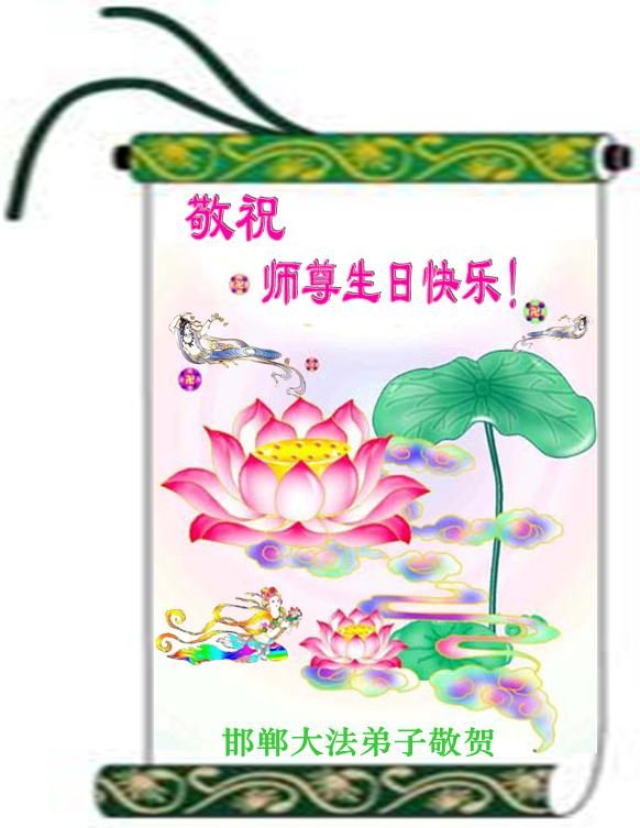 河北邯郸市所有流离失所在外的、在狱中承难的、在不同环境中遭受迫害的大法弟子恭祝慈悲伟大的师尊生日快乐!恭贺法轮大法洪传十四周年!
