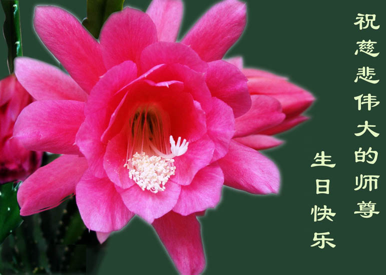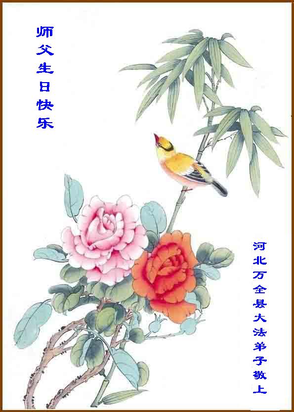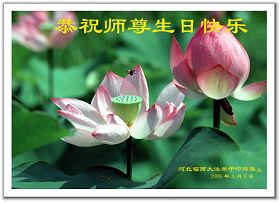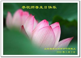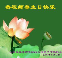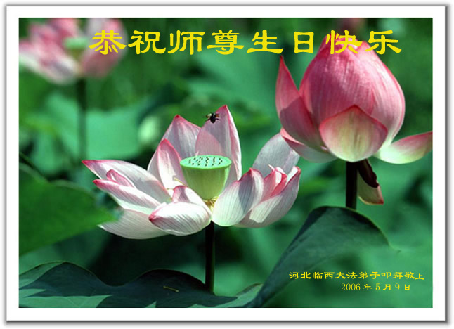 生命在大法中再生,在修炼中提升、回归,这是何等的殊胜,任何语言难以表达心中对您的感激。我们一定努力做好“三件事”,救度世人,早日修成圆满。 祝您生日快乐! 河北省巨鹿县大法弟子 合十 敬上 2006.05.02