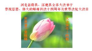 敬祝师尊生日快乐!师父您辛苦了!我们想念您!请师父放心,我们一定做好自己该做的事,走正最后的路! 全体河北省张家口万全县大法弟子敬上 河北省蔚县、涿鹿县全体大法弟子恭祝慈悲伟大的师尊传法十四周年及世界法轮大法日
