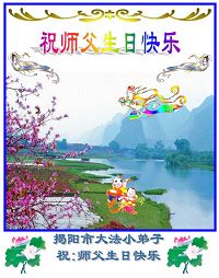祝老师生日快乐! 河南大法7岁小弟子。 06年5月4号。 黑龙江省依兰县全体大法弟子祝慈悲伟大的师尊生日快乐