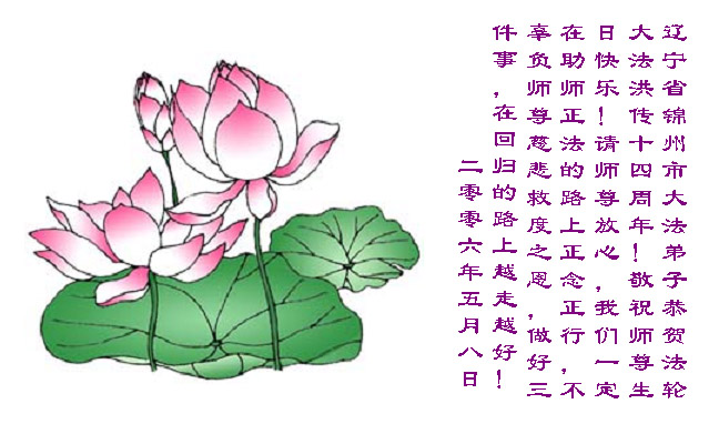 感谢师尊的慈悲苦度! 七年的风风雨雨中我们渐渐的成熟了,以后我们会在神的路上坚定的稳步前行,更加理智的做好大法弟子应该做好的三件事。 涞水县全体大法弟子 2006-5-9 辽宁省锦州市大法弟子恭贺法轮大法洪传十四周年!敬祝师尊生日快乐!