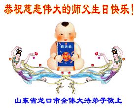请师尊放心,我们一定在助师正法的路上正念正行,不辜负师尊慈悲救度之恩,做好三件事,在回归的路上越走越好! 二零零六年五月八日 龙口市大法弟子恭祝慈悲伟大的师尊生日快乐!