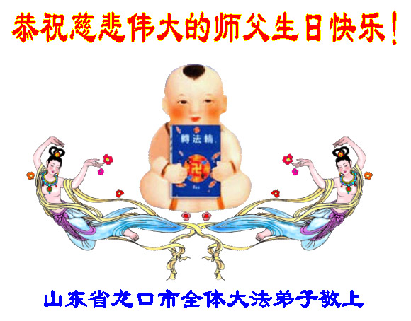 师父您好,您辛苦了,弟子非常想念您。在这法正人间的最后时刻,我一定精進实修,努力做好大法弟子应该做好的三件事,紧跟师父的正法進程,不辜负师父的慈悲苦度。 龙口市大法弟子叩拜师尊 2006年5月5日 山东省龙口市全体大法弟子恭祝慈悲伟大的师尊生日快乐!