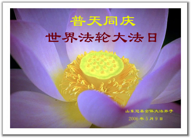 师父您好,您辛苦了,弟子们非常想念您。让我们在法正人间的最后时刻,精進实修,努力做好大法弟子应该做好的三件事,圆满完成我们助师正法、救度众生的史前大愿,不辜负师父的慈悲苦度。 龙口市全体大法弟子叩拜师尊 2006年5月5日 全体山东冠县大法弟子庆祝5.13世界法轮大法日