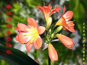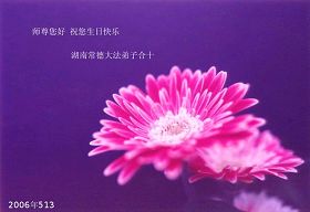 在正法修炼的路上,我们走过了风风雨雨的七个年头。其中的每一关,每一步都铭记着师尊的慈悲呵护。今天,我们成熟了,理智了,请师尊放心。在这最后的路上,我们会走得更好! 天津大法弟子 2006.5.8 北京海淀区二里庄大法弟子敬祝师父生日快乐!