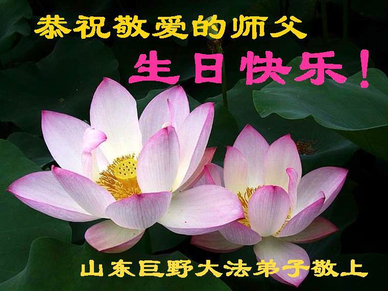 在伟大的师尊五十五岁华诞来临之际,山东一个小资料点全体大法弟子:恭祝伟大的师尊生日快乐!在这特殊的历史时刻我们与全世界所有大法弟子一起普天同庆、同祝、同颂法轮大法洪传十四周年暨第七届世界法轮大法日!敬祝伟大的师尊节日快乐!事事如意! 在此感谢师尊的慈悲苦度,我们一定谨遵师父的教诲,正念正行,做好三件事,敬请师尊放心! 山东一个小资料点全体大法弟子同庆同贺 2006年5月11日 山东巨野大法弟子恭祝敬爱的师父生日快乐!